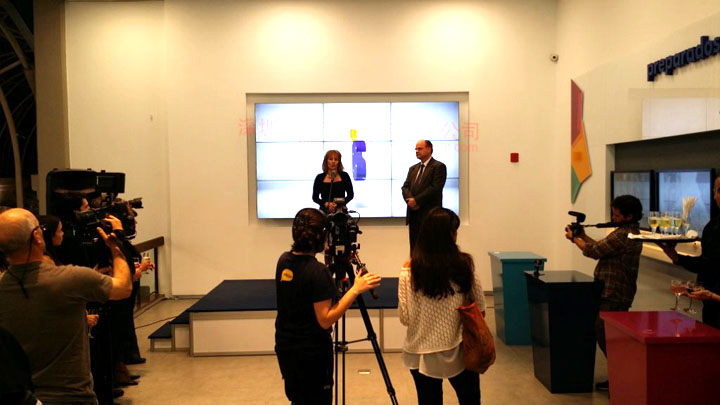 項(xiàng)目介紹:產(chǎn)品采用優(yōu)色液晶拼接大屏,2X2壁掛是安裝,5.3mm超窄邊拼縫。