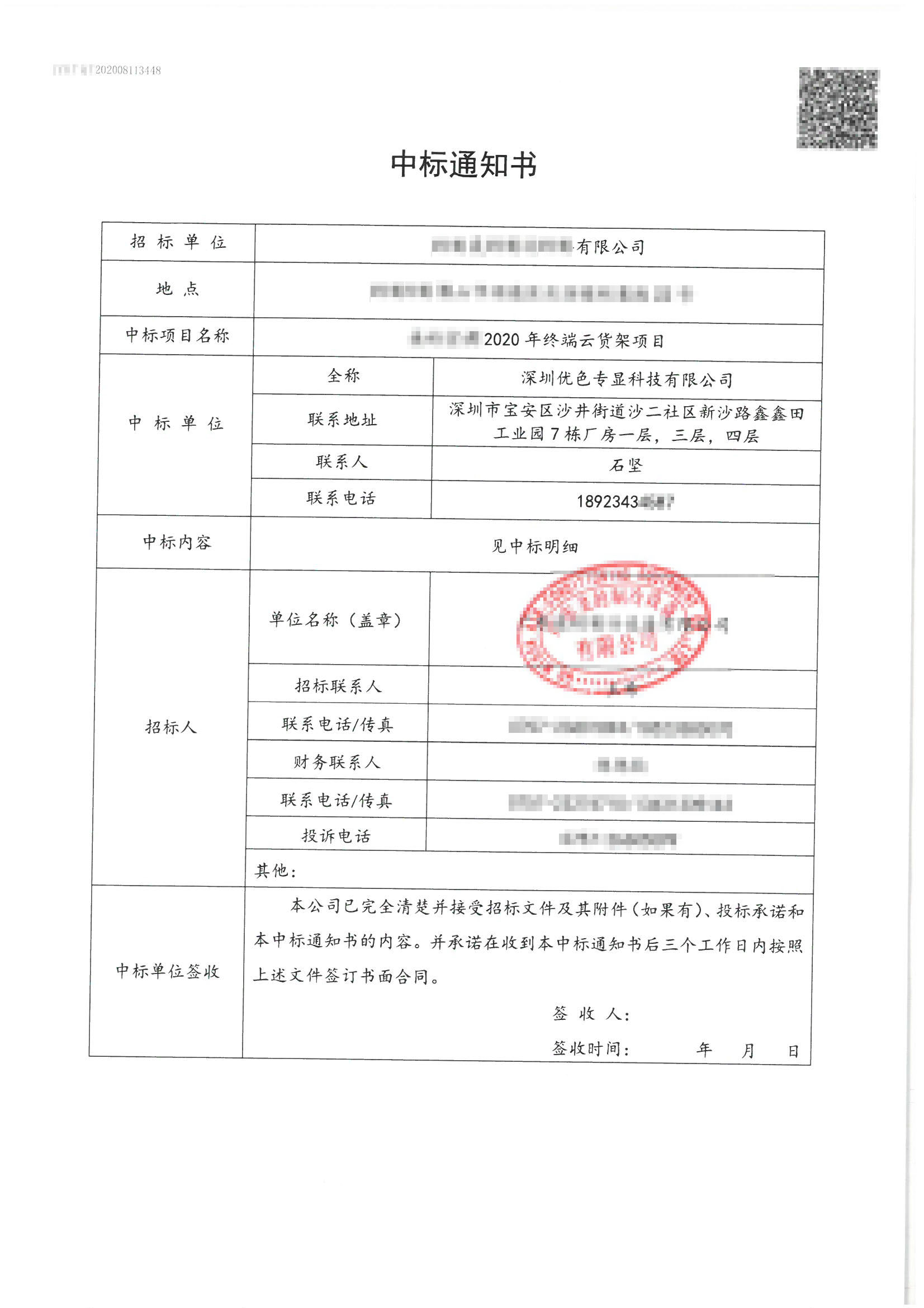 熱烈祝賀我司競標(biāo)世界500強上市企業(yè)“2020年終端云貨架項目”于2020年8月21日順利中標(biāo)。