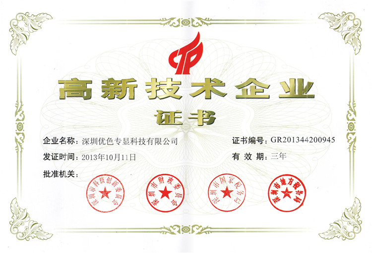 深圳優(yōu)色專顯科技有限公司榮獲國家高新技術(shù)企業(yè)稱號(hào)