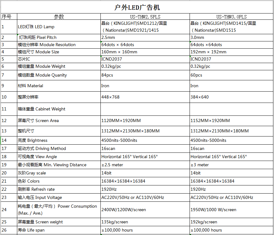 單屏LED戶外廣告機(jī)參數(shù):