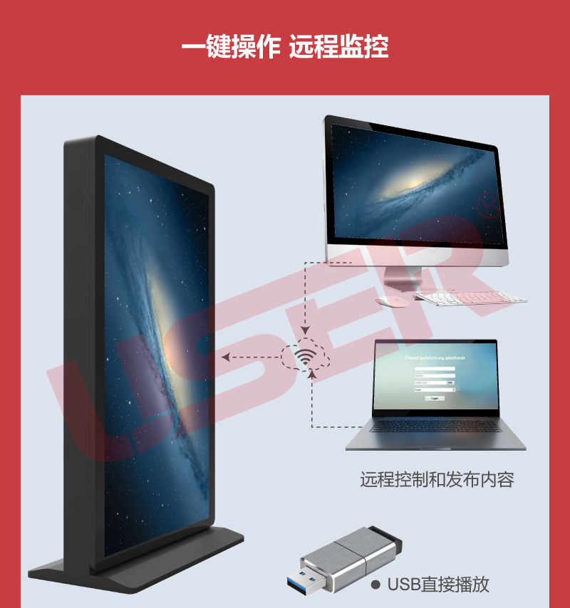 8.廣告機(jī)控制優(yōu)勢(shì),不需要知道終端的IP地址,不需要了解終端的接入方式及網(wǎng)絡(luò)結(jié)構(gòu),通過平臺(tái)即可管理任何一個(gè)接入系統(tǒng)的終端。