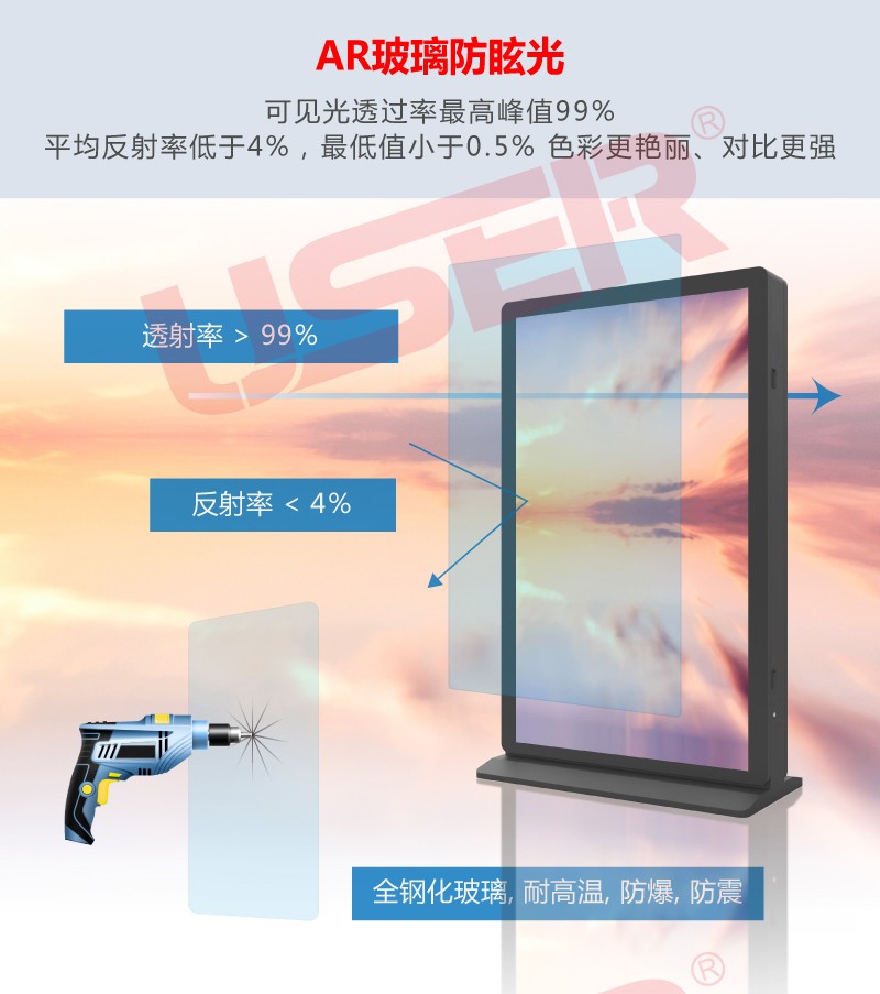 1.雙面戶外廣告機(jī),亮度可達(dá)到4000-5000nits ,太陽光環(huán)境下依舊清晰可視,壽命長,可持續(xù)運(yùn)行100,000小時;