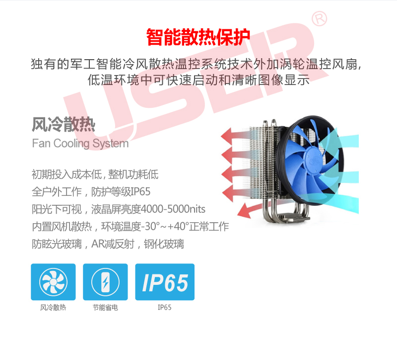 3.獨(dú)有的軍工智能冷風(fēng)散熱溫控系統(tǒng)技術(shù)外加渦輪溫控風(fēng)扇,環(huán)境使用可達(dá)-30℃-80攝氏度,低溫環(huán)境中可快速啟動和清晰圖像顯示;