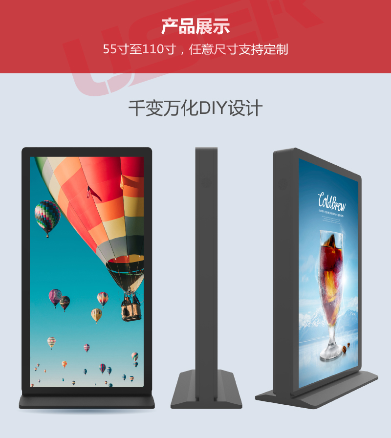 簡介:雙面戶外廣告機(jī)優(yōu)勢: 1.雙面戶外廣告機(jī),亮度可達(dá)到4000-5000nits ,太陽光環(huán)境下依舊清晰可視,壽命長,可持續(xù)運(yùn)行100,000小時; 2.優(yōu)秀的前維護(hù)工業(yè)設(shè)計(jì),精湛的加工工藝,保證了產(chǎn)品能在...