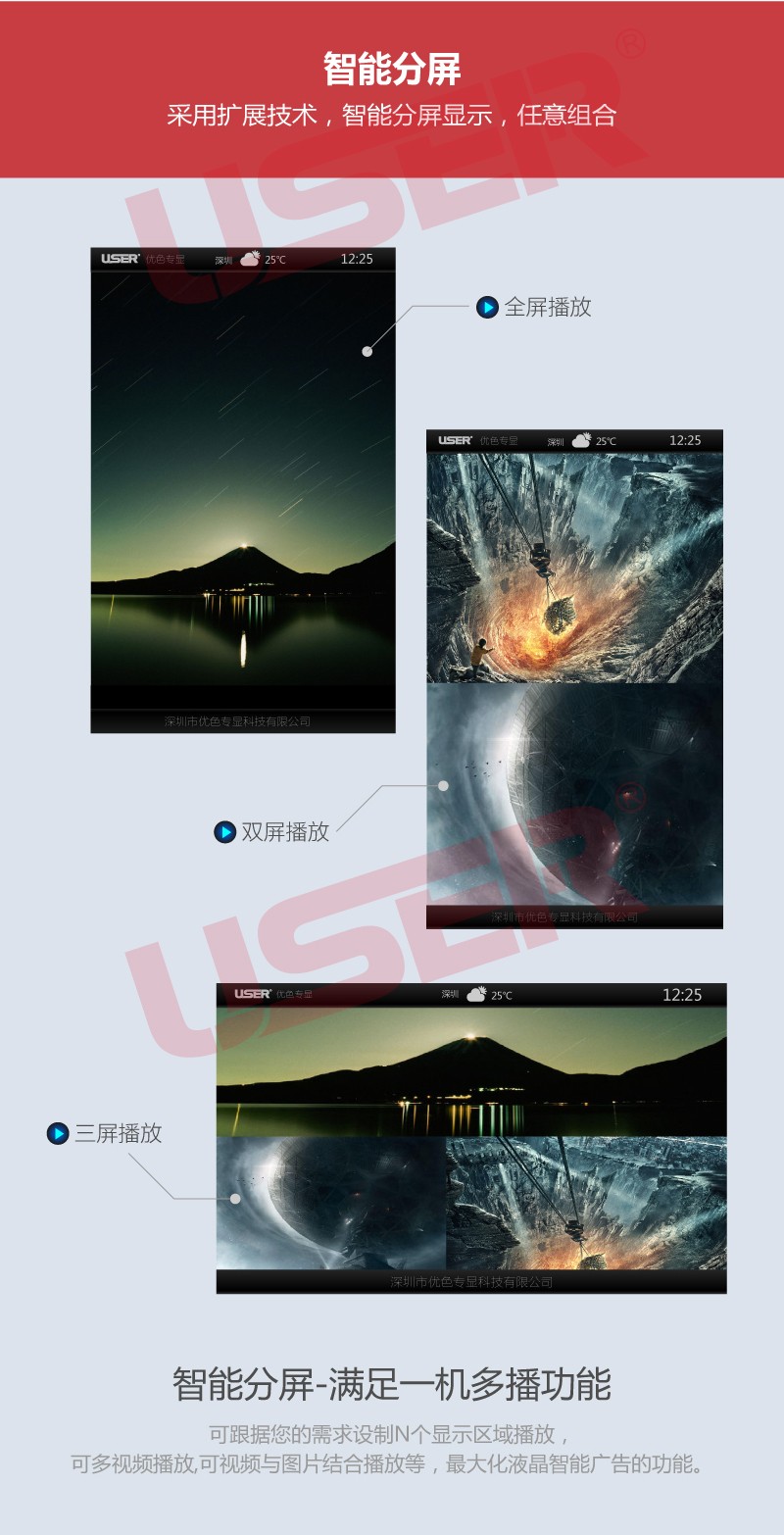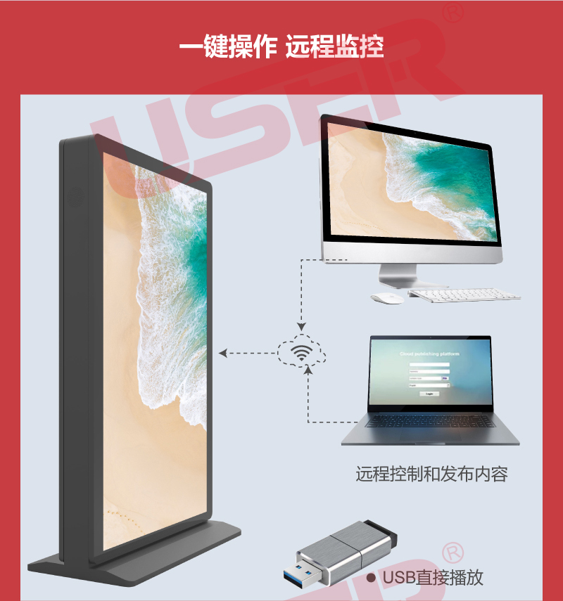 8.廣告機(jī)控制優(yōu)勢,不需要知道終端的IP地址,不需要了解終端的接入方式及網(wǎng)絡(luò)結(jié)構(gòu),通過平臺即可管理任何一個接入系統(tǒng)的終端。