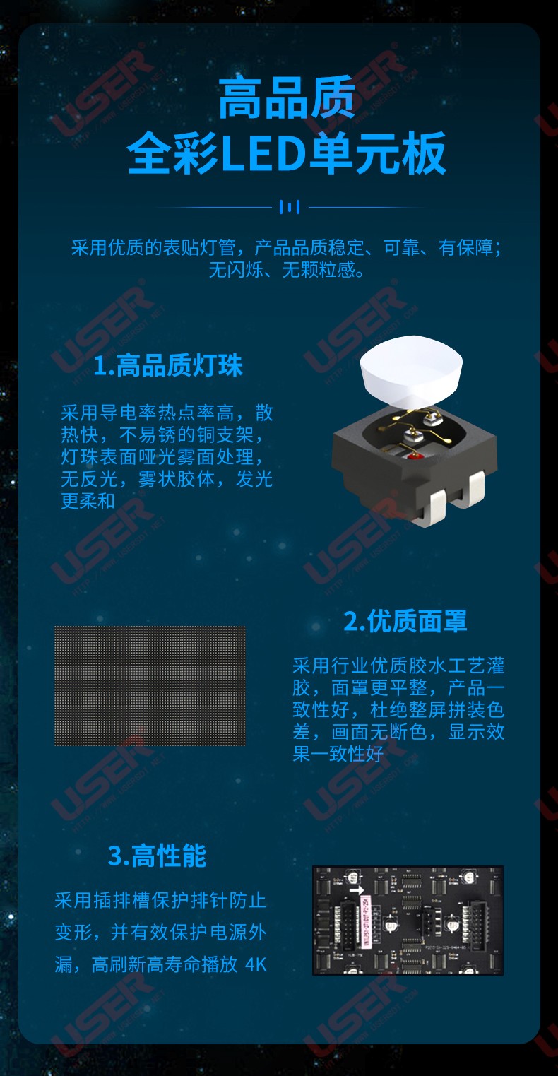 本產(chǎn)品為優(yōu)色專顯UC4室內(nèi)小間距產(chǎn)品,本系列產(chǎn)品采用 320x160mm 模塊,搭配使用 640x480mm壓鑄鎂鋁合金箱體,箱體拼接平整度佳,近距離觀看不易產(chǎn)生視覺顆粒感。產(chǎn)品采用高性能驅(qū)動 IC,低灰刷新頻率高,低灰過渡性好,支持HDR。