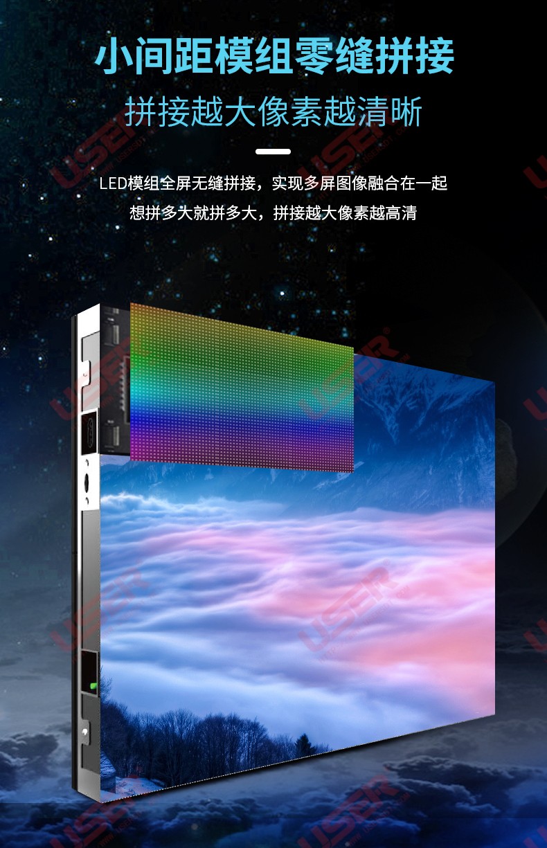 更小的像素間距,具有高密度顯示特性,適合近距離觀看,不易產(chǎn)生顆粒感。