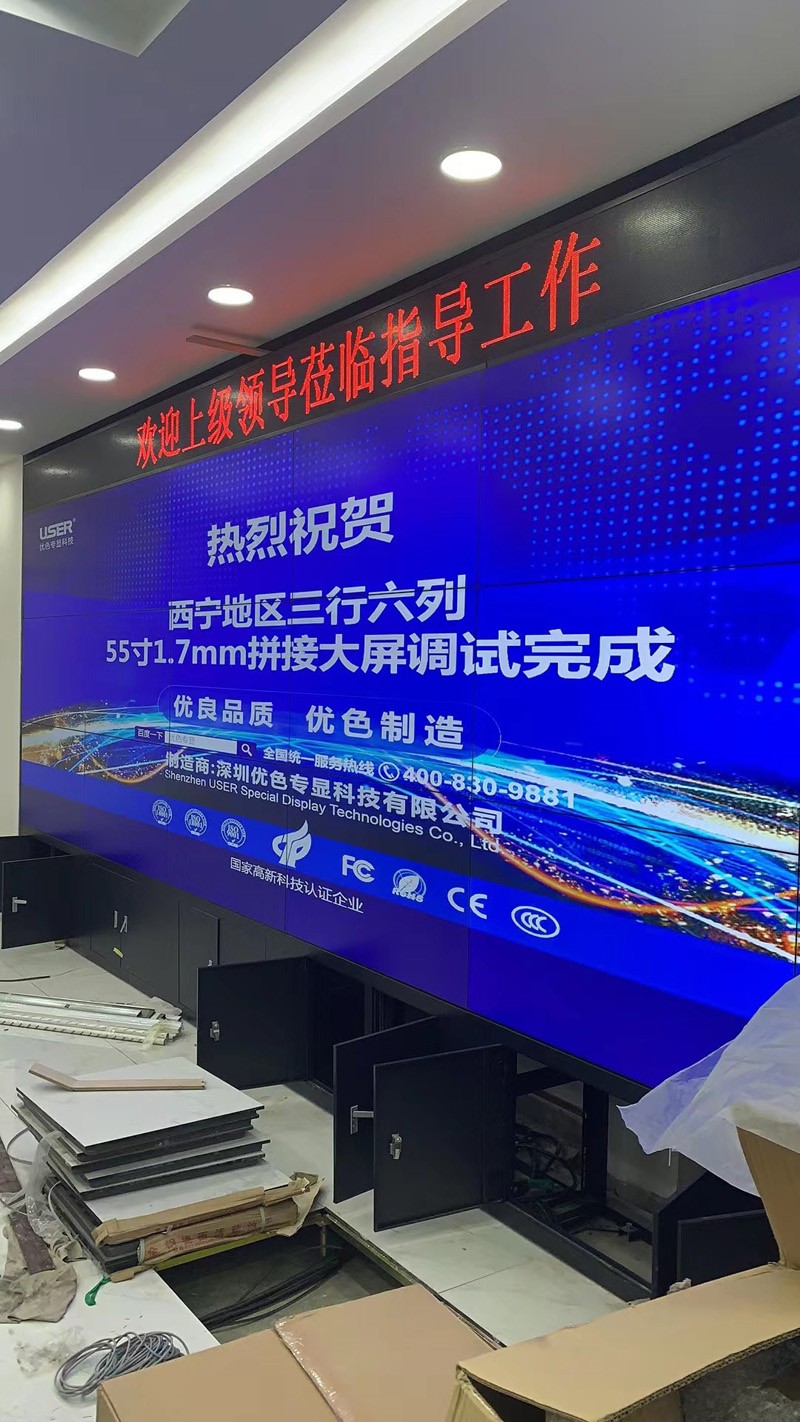 青海西寧黃河鑫業(yè)運維控制室液晶拼接屏,采用驗收專顯55寸1.8mm落地機柜頂部安裝LED條形屏方案,項目已安裝且驗收竣工。