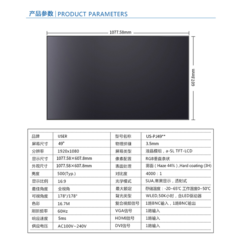 菜單產(chǎn)品中心Product center 液晶廣告機(jī) 壁掛式廣告機(jī) 落地立式廣告機(jī) 電梯超薄廣告機(jī) 車載廣告機(jī) 高亮廣告機(jī) 戶外廣告機(jī) 液晶拼接屏 專業(yè)液晶拼接屏 4K液晶拼接屏 廣告拼接屏 無(wú)縫液晶拼接屏 觸摸液晶拼接屏 LED顯示屏 觸控一體機(jī) 壁掛式觸控一體機(jī) 立式觸控一體機(jī) 斜面觸控一體機(jī) 智能家居觸控一體機(jī) 戶外觸控一體機(jī) 液晶電子白板 教育電子白板 會(huì)議電子白板 工控一體機(jī) 觸摸顯示器 紅外觸摸顯示器 電容觸摸顯示器 電阻觸摸顯示器 聲波觸摸顯示器 納米觸摸顯示器 液晶監(jiān)視器 專業(yè)級(jí)監(jiān)視器 4K監(jiān)視器 嵌入式監(jiān)視器 機(jī)架式監(jiān)視器 開(kāi)放式監(jiān)視器 SDI監(jiān)視器 高亮監(jiān)視器 廣播級(jí)監(jiān)視器 工業(yè)顯示器 4K顯示器 機(jī)架式顯示器 開(kāi)放式顯示器 醫(yī)療顯示器 KVM顯示器 指揮室顯示器 智慧校園產(chǎn)品 專業(yè)定制商顯 多屏廣告機(jī) 多功能觸控一體機(jī) 多功能廣告機(jī) 微信打印廣告機(jī) 魔鏡廣告機(jī) 透明廣告機(jī) 全息廣告機(jī) 條形屏廣告機(jī) 旋轉(zhuǎn)廣告機(jī) 裸眼3D廣告機(jī) 人工智能產(chǎn)品 顯示配套設(shè)備 拼接配套設(shè)備 廣告機(jī)播放盒 OPS播放盒 拼接支架 移動(dòng)支架 相關(guān)軟件 吊頂支架 線材 木架 蜂窩箱 桌面底座 熱門產(chǎn)品 →優(yōu)色3.5mm超窄邊46寸液晶拼接屏→優(yōu)色49寸3.5mm超窄邊液晶拼接屏→優(yōu)色3.5mm超窄邊55寸液晶拼接屏 您的位置:首頁(yè) → 公司產(chǎn)品 → 液晶拼接屏 → 專業(yè)液晶拼接屏 優(yōu)色49寸3.5mm超窄邊液晶拼接屏類別:專業(yè)液晶拼接屏 簡(jiǎn)介:◆ 型號(hào):US-PJ49** ◆類型:三星/LG/京東方BOE面板 ◆亮度:500-700cd/m2(可選) ◆超窄邊設(shè)計(jì),拼縫3.5mm ◆ 在ISO9001嚴(yán)格的質(zhì)量控制體系下生產(chǎn)? ◆ 色彩均勻,圖像穩(wěn)定,為拼接大畫面定制... 在線咨詢 返回列表 產(chǎn)品說(shuō)明 相關(guān)產(chǎn)品 優(yōu)色1.7mm超窄邊55寸液晶拼接屏 優(yōu)色49寸1.8mm超窄邊液晶拼接墻 優(yōu)色49寸3.5mm超窄邊液晶拼接屏 優(yōu)色3.5mm超窄邊55寸液晶拼接屏 優(yōu)色3.5mm超窄邊46寸液晶拼接屏 優(yōu)色5.3mm超窄邊55寸液晶拼接屏
